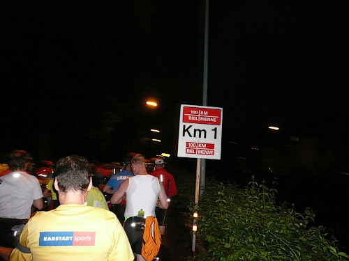 Countdown, auf die Sekunde genau um 22.00 Uhr werden wir auf die Strecke zu den 53. Bieler Lauftagen mit einem Schuss losgelassen. Als Fotograf mit einfacher Ausstattung ist es schwierig, geeignetes Bildmaterial zu sammeln. Dunkelheit, vielleicht später Regen, Landschaftsaufnahmen bringen jetzt eh nichts, ein schwieriges Terrain für laufende Reporter. Bilder von Verpflegungsstellen und da, wo in den Orten gute Beleuchtung vorhanden ist, können eher gehen. Oder warten, bis zum nächsten Morgen. Und wenn man da platt ist oder zuvor aussteigen muss? Oder die Kamera ist abgesoffen? Was dann?