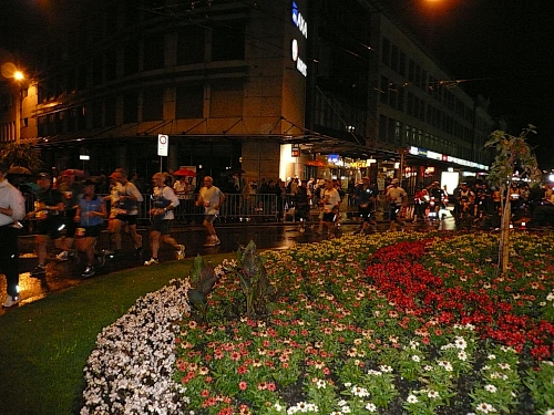 Über die General-Dufour-Strasse laufen wir wieder zurück in die City, um am Kreisverkehr des Zentralplatzes endgültig auf die Hunderterschleife einzubiegen. Viele Zuschauer stehen am Rand der Strecke und feuern uns an. Nach meiner Einschätzung sind es aber weniger als letztes Jahr. Grund wahrscheinlich die nasse Witterung. Petrus lässt es jetzt wieder tröpfeln. Dirk Pretorius aus Erftstadt ist guter Dinge, auch wenn ich ihn jetzt hinter mir lasse. Am Emmendamm wird er später zur Hochform auflaufen.