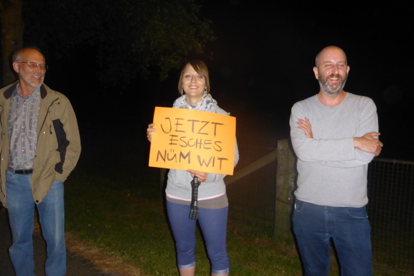 Bisher hatte ich die Stirnlampe definitiv nicht gebracht. Nun bin ich aber in einem Wäldchen und ausgerechnet hier ist keine Lampe weit und breit. Es ist stockdunkel. Zwei schnelle Hirsche mit Lampe nähern sich von hinten und sind gleich wieder vorbei. Wenigstens geht es geradeaus. In der Ferne kann ich die Lichter einer Straße erkennen. Unsicheren Schrittes kann ich diese dann auch bald erreichen. Im Straßenlicht prüfe ich erst mal, wo der Schalter meiner Lampe denn nun ist. Aha, an der Seite. Jetzt habe ich endlich mein eigenes Licht.