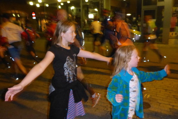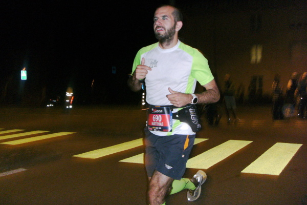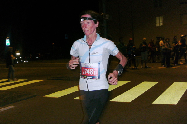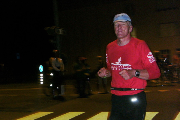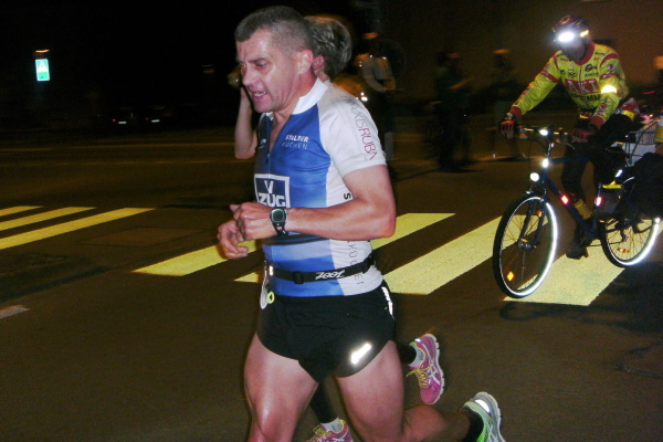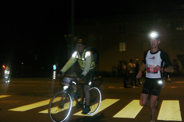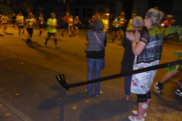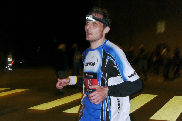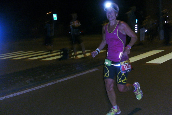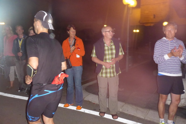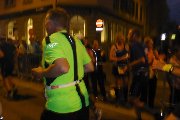Das Lied ist zu Ende und immer noch stehen Zuschauer da und feuern uns an. Im dichten Feld muss man höllisch aufpassen, um nicht zu stolpern. Trotz der Dunkelheit ist die Straße taghell erleuchtet und man sieht ganz gut. Nur die Pfosten, die regelmäßig in der Mitte der Straße auftauchen, sorgen für manche unangenehme Überraschung. Eine erste Wasserstelle nutze ich, mir Wasser über den Kopf zu schütten. Nun wird es ruhiger. Wir sind noch in der Stadt. Immer wenn man gerade etwas entspannen will, kommen wieder Ansammlungen von Fans, die einen aufputschen und anfeuern.