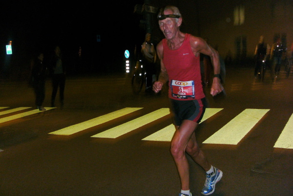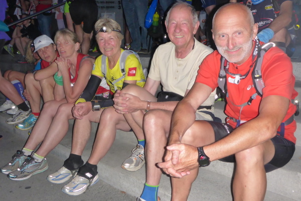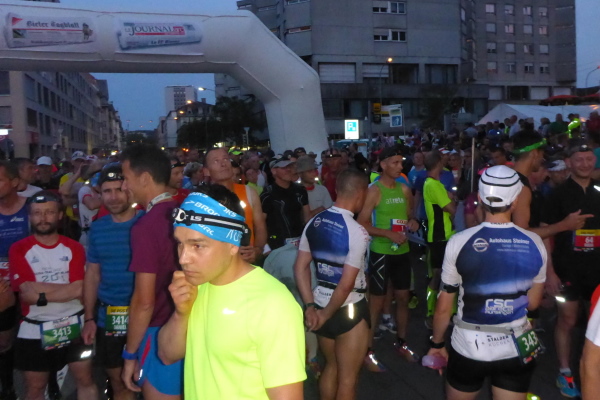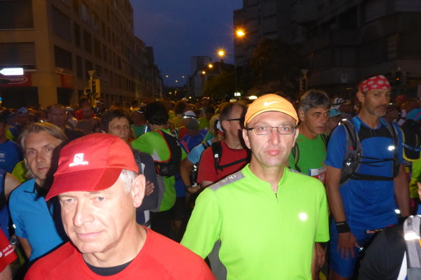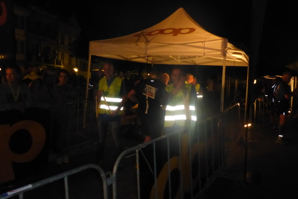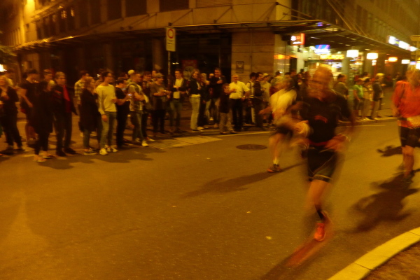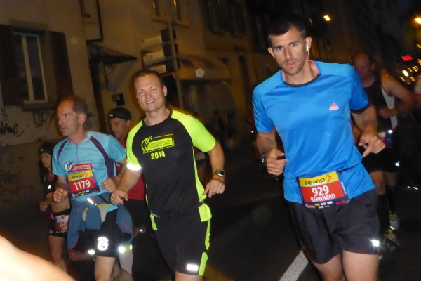 Um 21 Uhr 30 ist die Abfahrt der Begleitradler. Gemeinsam fahren sie unter Polizeischutz nach Lyss, wo sie sich dann mit ihrem Läufer treffen. Ich verabschiede Norbert und trolle mich Richtung Start. Der abgesperrte Startbereich vor dem Kongresshaus ist leer. Dafür sind die Straße und die Treppe davor mit Läufern bevölkert. Jeder entspannt auf seine Weise. Ich bin so nervös, dass ich den Lautsprecherdurchsagen nicht wirklich folgen kann. Nur, dass die Sieger der beiden letzten Jahre auch am Start sind und natürlich viele, die bereits zum zwanzigsten Mal oder noch öfter gefinisht haben, bekomme ich mit.