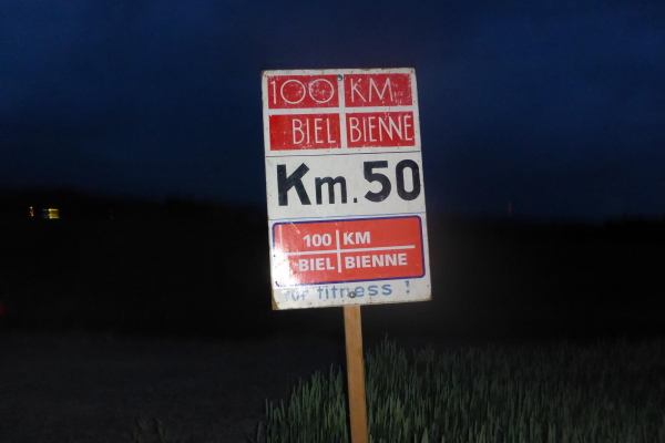 Plötzlich wird es laut hinter mir. Ein Radler klingelt und kündigt den führenden Marathoni an. Marathon und Halbmarathon sind eine halbe Stunde nach uns gestartet und beide Strecken haben noch eine zusätzliche Schleife in Biel gedreht. Damit haben die per se schnelleren Marathon- und Halbmarathonläufer die Chance, durch ein nur noch lockeres Ultrafeld laufen zu müssen. Trotzdem ist es ganz schön schwierig. Ab jetzt kommen immer öfters schnelle Läufer von hinten, die sich im Slalom durch das Ultrafeld bewegen.
