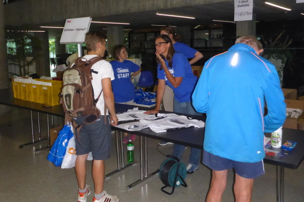 Bereits am Ortseingang ist der Parkplatz für die Läufer ausgeschildert. Für 10 Franken kann das Auto hier bis Samstag gut untergebracht werden. Um zum Kongresshaus zu gelangen, geht es immer geradeaus, allerdings ist es ein gutes Stück zu laufen. Für die Startnummernausgabe benötigt man die Starterkarte und einen Lichtbildausweis, das Veloticket gibt es am Stand gleich nebenan. Weil wir früh dran sind, ist noch wenig los. Wir verkrümeln uns in eine Ecke des Kongresshauses um uns nochmal abzulegen, denn die Nacht wird lang.