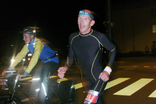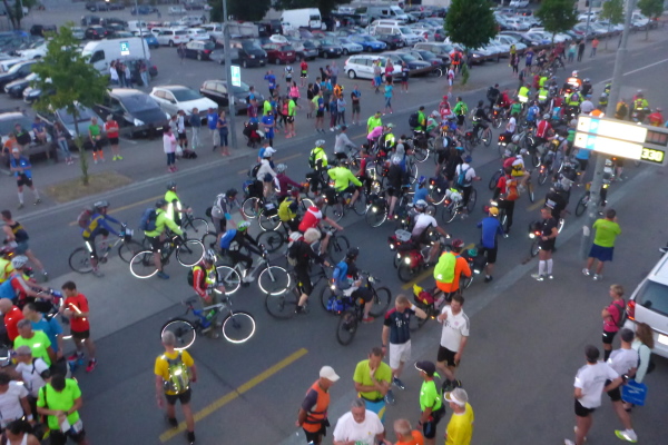 Gegen 20 Uhr wird es zusehends voller. Die ersten Bekannten trudeln ein. M4you Kollege Anton ist mit von der Partie, dann natürlich Kati, die Erstling Axel mitgebracht hat, die beiden Gerhards, Andrea, die ich beim Comrades kennengelernt habe und noch einige andere nicht minder wichtige Freunde. Um 21 Uhr ist die Besammlung der Velofahrer vor der Sporthalle Esplanade. Da dort auch die Abgabe der Taschen sein soll, machen wir uns rechtzeitig auf den Weg. Es geht nur ca. 100 m über die Straße. Dort erfahren wir, dass man nur seine Wertsachen abgeben und eine Tasche an die verschiedenen Wechselpunkte schicken lassen kann. Sonstiges Gepäck kann man aber in der weitläufig verzweigten Halle deponieren. Weil wir keine Wertsachen dabei haben, lassen wir unsere Tasche einfach bei den anderen im Umkleideraum.