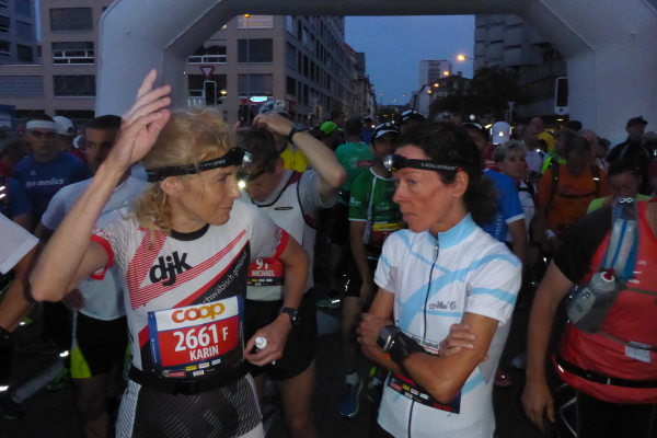 Auf der Treppe sehe ich ein bekanntes Gesicht. Die Läuferin, die wir auf der Kloßparty beim Rennsteiglauf getroffen hatten, Silke Ahrendts-Konold, die dann für mich unerwartet, als Zweite den Lauf beendete, ist auch hier. Sie ist ebenfalls zum ersten Mal in Biel und hat sich eine Zeit um die neun Stunden vorgenommen. Später erfahre ich, dass sie mit 8:43:14 auch hier in Biel auf den zweiten Platz gelaufen ist. Da bin ich baff.