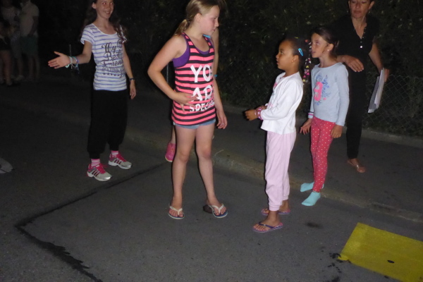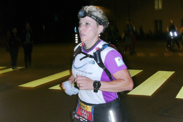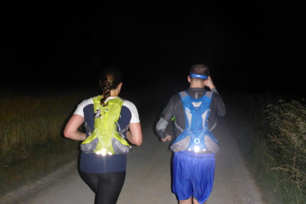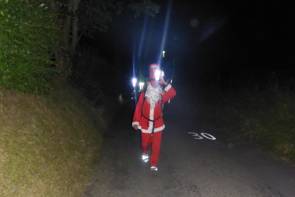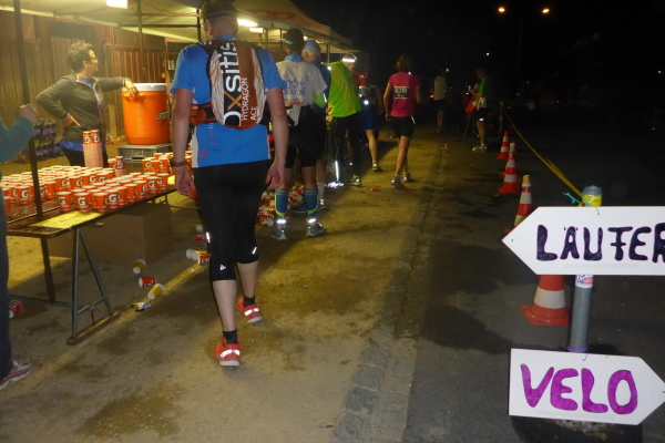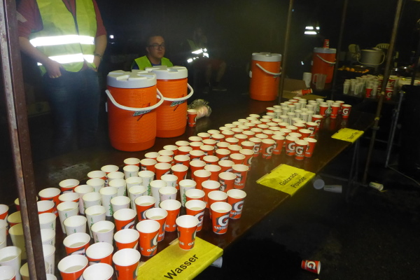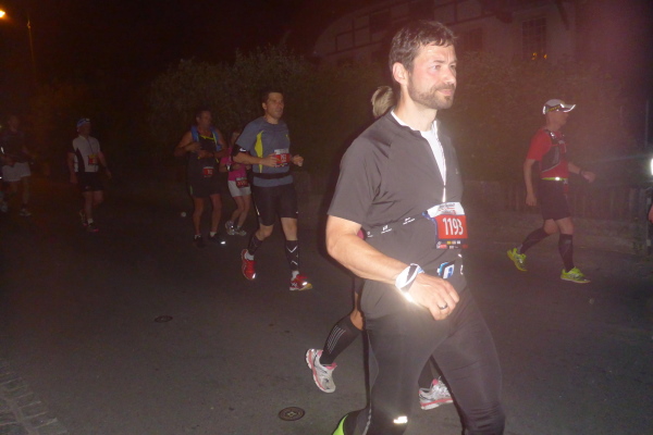 Das erste Schild zeigt km 5. Dahinter folgt eine Steigung, an der sich die Anwohner eingefunden haben, um die Läufer abzuklatschen. Obwohl es mir wegen der vielen Zuschauer schwer fällt, muss ich hier gehen, denn ich darf meine Kräfte nicht verschwenden. Es ist mit 19 °C am Start um diese Uhrzeit ohnehin sehr warm. Bereits an der ersten VP greife ich zum Wasser. Das Feld ist nun etwas lichter und ich versuche ein geeignetes Tempo zu finden. Noch habe ich die Stirnlampe um meinen Arm gewickelt. Obwohl ich sie nicht brauche - es ist immer jemand mit Lampe um mich herum - versuche ich sie einzuschalten. Aber wo ist der Schalter? Wir haben zuhause mehrere Lampen und ich hab eine erwischt, die ich nicht beherrsche. Wieso habe ich nicht vor dem Start ausprobiert, wie man das Ding einschaltet? Wie blöd kann man nur sein? Ich ärgere mich ein wenig.