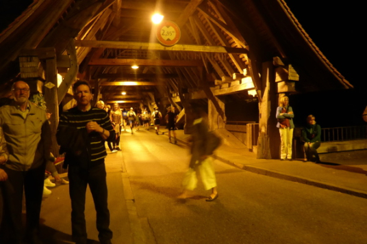 Erstaunlich schnell erreichen wir die überdachte Holzbrücke von Aarberg bei km 18. Hier ist natürlich wieder ein Zuschauer Hotspot. In Aarberg ist am Halbmarathonziel viel Tamtam. Auch jeder Ultra wird namentlich und mit viel Applaus begrüßt. Etwas abseits ist dann die zweite VP. Ich muss trinken, denn es ist immer noch zu warm.