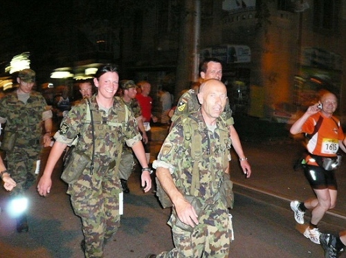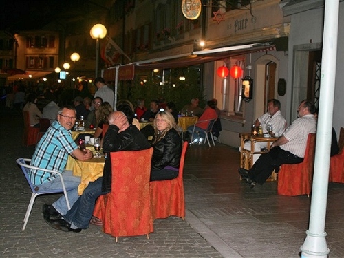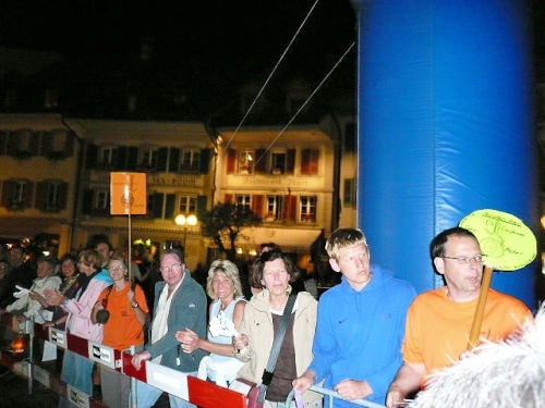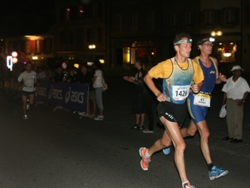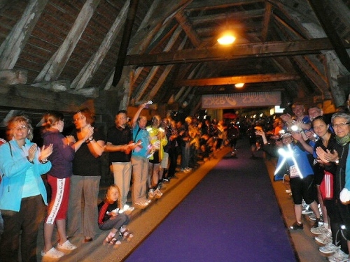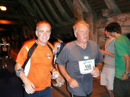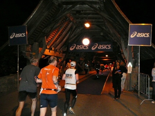 Auf das Erlebnis der 400 Jahre alten gedeckten Holzbrücke bei Aarberg habe ich mich gefreut und werde auch nicht enttäuscht. Wie aus dem Nichts steht sie plötzlich vor mir, die Zuschauer stehen dicht an dicht an den Rändern und spenden reichlich Beifall. Noch reicht die Kondition zum Straffen des Rückens sowie für entspanntem Gesichtsausruck. Toll ist das Erlebnis, auf einem extra ausgerollten blauen Teppichboden zu laufen, richtig edel. Zu unserer großen Freude haben es sich unsere Frauen nicht nehmen lassen, uns an dieser Stelle anzufeuern und einen Teil der Nacht mit uns zu verbringen. Der Lohn dafür wird sofort „mündlich“ übermittelt. Danach dürfen sie schlafen gehen, um morgen als persönliche Pflegekräfte wieder fit zu sein.