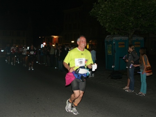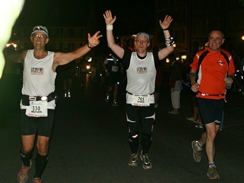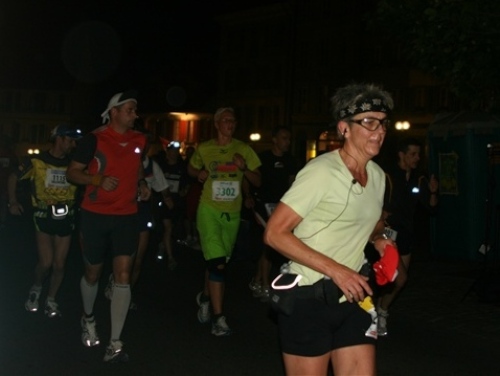 Hinter der Brücke beglückt uns der unvergleichliche Anblick des hellerleuchteten historischen Marktplatzes, den wir bereits gestern besichtigen konnten, so können wir das Erlebnis noch mehr genießen. Auf dem Anger findet auch der erste Stafettenwechsel (5 Läufer) statt, gleichzeitig befindet sich hier das Halbmarathonziel. Leider ist dieser schöne Moment wirklich nur ein solcher und kurze Zeit später schon wieder vorbei. Noch haben wir kaum angefangen und noch über 81 km vor uns.