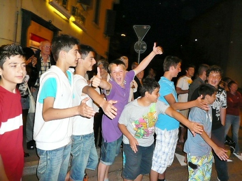 Den ersten Anstieg hinter Port bei km 8 von 120 Höhenmetern über einen km laufe ich nicht und nehme die Warnungen ernst. 100 km sind für mich gar nicht einzuschätzen und ich vermeide jede Kraftvergeudung. Zügig schreite ich nach oben. Auch hier steht noch jede Menge Volk am Straßenrand, das uns freundlichen Beifall spendet. Schön ist der Blick zurück auf das erleuchtet Biel, aber die Kamera ist leider überfordert beim Versuch, das einzufangen. Herunter laufe ich wieder und versuche dabei, die Oberschenkelmuskulatur möglichst zu schonen. Licht ist überhaupt keines vonnöten, denn noch sind wir der Straßenbeleuchtung nicht entkommen.