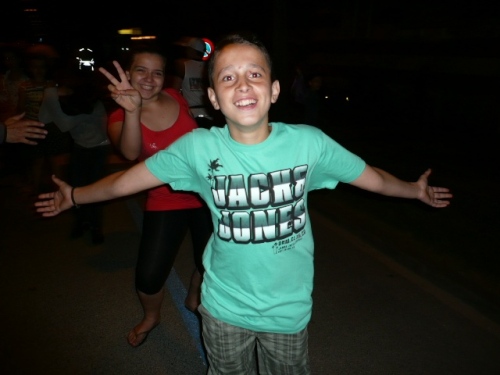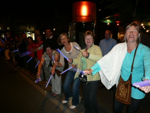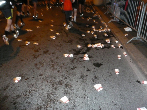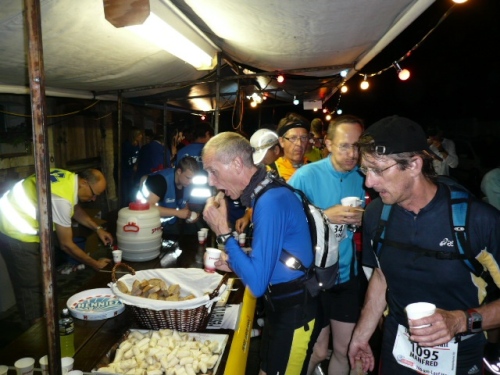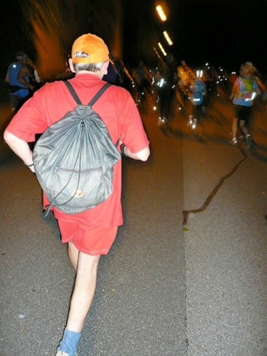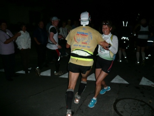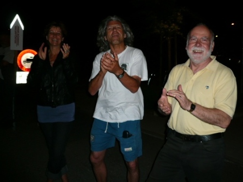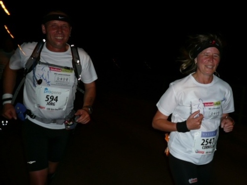 Über etliche Feldwege, die dank des hellen Untergrundes trotz Neumond (= kein Mond) und wolkenverhangenem Himmel gut ohne eigenes Licht zu belaufen sind, geht es weiter zu unserem ersten wichtigen Zwischenziel. Km 15 ist nach 1:37 Std. erreicht. Jemand spielt Tanzmusik und ein Läuferpärchen läßt sich nicht lumpen und dreht einige Tanzrunden. Wir beeumeln uns vor Lachen. Scheinbar hat es nicht geschadet, denn zumindest Christiane hat das Ziel in 14:36 Std. erreicht.