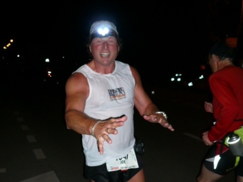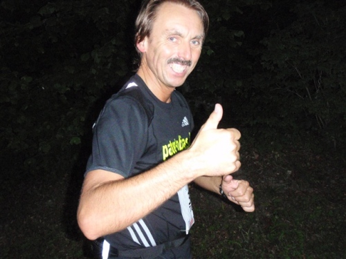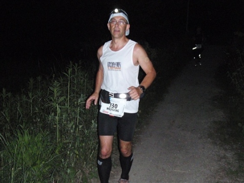 Jetzt geht es wirklich in die Wallachei. Vermutlich ist es gut und ein Vorteil der Nachtlauferei, daß man kaum nach vorne sehen und das vor einem Liegende nicht einschätzen kann. So wird halt einfach Fuß vor Fuß gesetzt und km für km genommen. Leider verlieren wir Jörg und Heinz an der nächsten Verpflegungsstelle und laufen alleine weiter. Das Verpflegungsangebot ist hervorragend. Niemand muß etwas mitschleppen, völlig überflüssig. Das Sortiment ist von Stelle zu Stelle leicht unterschiedlich, aber reichhaltig und abwechslungsreich. Ich erinnere mich an Wasser, Iso, Pfirsichtee, Bouillon, Cola, Brot, Bananen, Orangen, Äpfel, div. Riegelsorten und Süßigkeiten. Bestimmt habe ich noch etwas vergessen. Wer hier nichts Passendes gefunden hat, dem ist wahrlich nicht zu helfen.