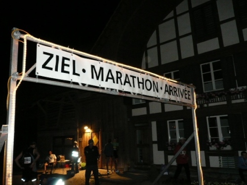Schon lange warte ich darauf, müde zu werden. Und damit ist auch wirklich zu rechnen, den mein Biorhythmus ist um 22 Uhr normalerweise auf Bubu machen eingestellt. Nichts dergleichen erfolgt. Ich laufe konzentriert, bin wach und fühle mich frisch. Sehr sonderbar. Aber das zeigt, wie unterschiedlich Läufer reagieren und vermutlich ist das das bei den Wiederholungstätern auch jedes Jahr unterschiedlich. Schön anzuschauen, nützlich und von den Läufern gerne genutzt sind die zahlreichen Brunnen und Wassertröge, die sich vor etlichen Bauernhäusern befinden und angenehme Kühle spenden. A propos Kühle: Die Temperatur fällt wohl kaum unter 15° und ich werde am Ende die Jacke umsonst mitgeschleppt haben, denn außer ein paar Tröpfchen werden wir vom angedrohten Wolkenbruch glücklicherweise nichts abbekommen.