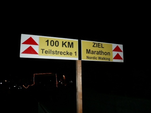 Oberramsern ist nach 38,5 km Marathonziel und zweiter Stafettenwechsel. Hier ist auch die erste „Cut off-Stelle“, wie es so schön neudeutsch heißt. Um 5.15 Uhr muß man hier durch sein; damit sollten, wenn überhaupt, nur reine Wanderer ein Problem haben. Die müssen wenigstens einen knappen 5 km-Schnitt pro Std. hinbekommen, wenn sie in der geforderte Zeit von 21 Std. durchkommen wollen. Einundzwanzig Stunden. Meine Güte!