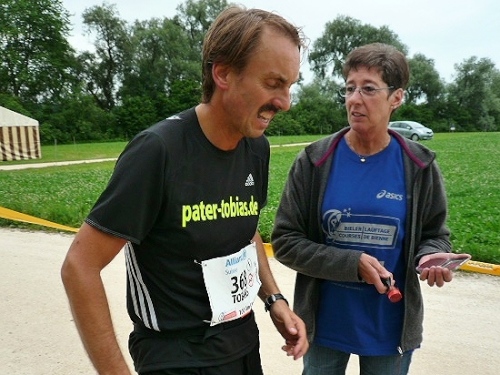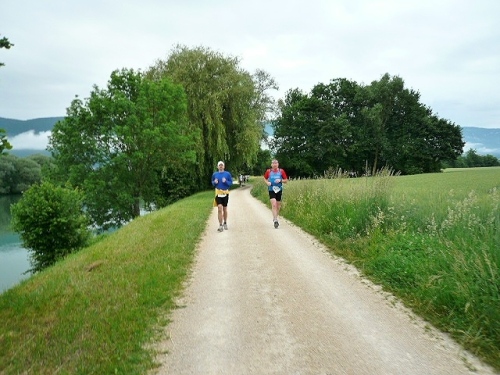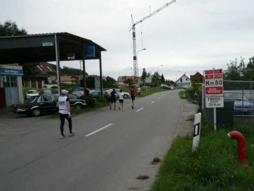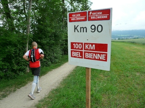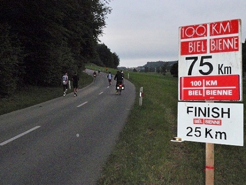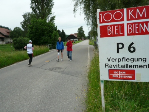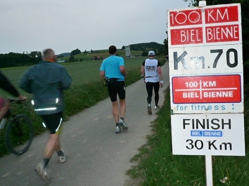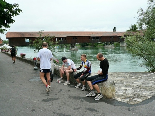 Es folgt ein langer Anstieg von Gerlafingen bis kurz hinter Bibern, die wir erneut zum Gehen und damit Regenerieren nutzen. Hatte ich vorher noch groß getönt, die Konditorei in Lüterkofen bei km 72 zum Kaffeetrinken und Croissantessen nutzen zu wollen, winke ich am Ort des Geschehens nur noch müde ab. Mann, bin ich ein Schlaffsack. In Bibern befindet sich dann die dritte und letzte Cut off-Stelle, hier muß man um 15.15 Uhr durch sein. Wie auch bei den beiden anderen offiziellen Ausstiegsmöglichkeiten verschwende ich an ein vorzeitiges Ende keinen Gedanken, mental bin ich wirklich top drauf. Nur der Rest halt...