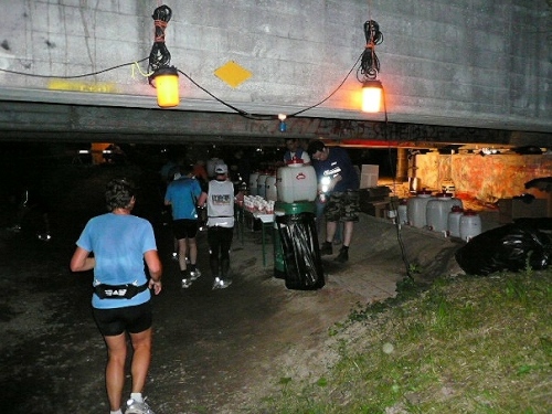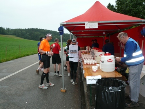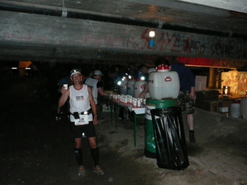 Super ist auch, daß gerade die Dämmerung beginnt. Das zunehmende Vogelgezwitscher ist herrlich anzuhören. Wann erlebt man das schon mal derart intensiv? Und dann gibt es tatsächlich einige Helden, die sich die Ohren mit Musik volldröhnen. Keine Frage – ich kann das auch gut haben, aber doch nicht hier! Eine tolle Verpflegungsstelle ist unter einer Brücke plaziert. Die Helfer werden hier nie naß und sicher von vielen anderen darum beneidet. Überhaupt Helfer: Sagenhaft, was die leisten! So lange auf und nie sehe ich mürrische Gesichter. Danke, liebe Schweizer Freunde! Der Läufer freut sich halt immer aufs nächste Happahappa. Km 60 kommt bei 6:59 Std.
