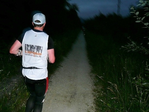 Der erste Abschnitt ist leicht zu laufen, ist ein schmaler, heller Kiesweg. Dann aber taucht er in einen Waldabschnitt ein und es wird richtig dunkel. Ich bin froh, erstens meine und zweitens genau diese Stirnlampe dabei zu haben. Sie ist sagenhaft hell und leuchtet den Weg phantastisch aus. Etwas schwieriger zu belaufen sind dann die Teile, die über Wurzeln und Kieselsteine führen. Aber wiederum ehrlich und ohne Angabe: ich habe mir das aufgrund einiger Beschreibungen wesentlich dramatischer vorgestellt. Wer nicht nur auf Asphalt läuft, sondern einigermaßen landschaftslauferfahren ist, wird keine Probleme bekommen. Es sei denn, man ist schon so erschöpft, daß nur noch ein Stolpern möglich ist.