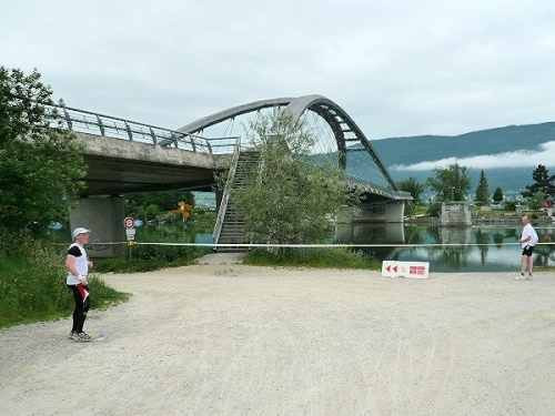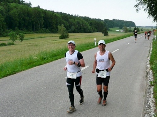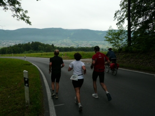 Brutal ist dann der lange Anstieg von Arch, steil und heftig, gerade bei der jetzigen Erschöpfung. Aber: wo ein Anstieg ist, kommt irgendwann ein Scheitelpunkt und der erholsame Abstieg. Ach, Du meine Güte, von wegen erholsam. Meine Oberschenkel quietschen beim Abbremsen und wenn ich versuche es rollen zu lassen, muß ich fürchten, mich zu überschlagen. Also geht es relativ vorsichtig oberschenkelintensiv diese lange, lange Strecke bergab. Km 80 wird nach 9:34 Std. passiert. Ich merke, daß Markus besser drauf ist und schicke ihn an der nächsten Flachpassage bei etwa km 82 vor. Er ziert sich erst etwas, zieht aber dann schnell ab und ist fast sofort aus meinem Blickwinkel verschwunden. Auf diesen letzten 18 km wird er eine gute halbe Stunde herauslaufen. Respekt, mein Lieber!