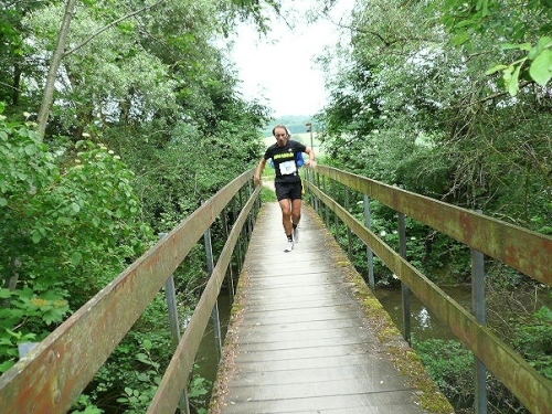 Nach dem Emmendamm kann ich die Landschaft gut überblicken und leider auch wieder Entfernungen einschätzen. Da muß ich halt jetzt durch, es hilft ja nichts. Schön ist nun, daß immer wieder Brücken zu überqueren sind, die Abwechslung in die Lauferei bringen. Langsam beginne ich, Tempo einzubüßen und fange an, mich auf jede Steigung (= Gehen) zu freuen. Dann muß ich auch den einen oder anderen Meter mal aufs Laufen verzichten und versuche so, wieder Kräfte zu sammeln. Viel kommt aber nicht mehr. Interessant: Müde fühle ich mich noch immer nicht, nur zunehmend saft- und kraftlos. Aber das ist nach über 70 km (8:16 Std) sicher nichts ungewöhnliches.