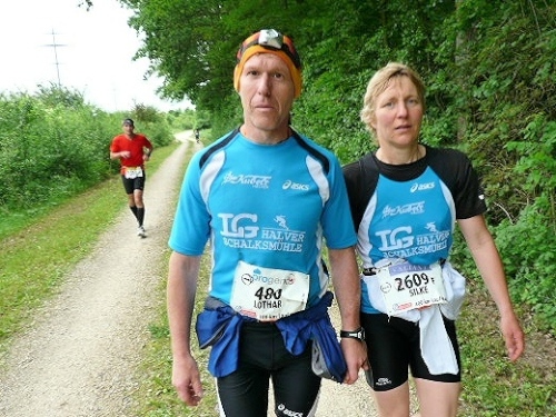 Km 95 (11:31 Std). Jetzt ist jeder der restlichen 5 km ausgeschildert. 96. 97. 98. Silke und Lothar gehen Hand in Hand, ein schönes Bild. Für mich. Ich knipse sie und in ihrer Erschöpfung sind sie zunächst etwas unwirsch. Ich erkläre ihnen, warum ich die Bilder mache und biete an, das von ihnen zu löschen. Nein, das sei dann doch OK. Mir gefällt gerade diese Szene besonders gut, denn sie zeigt, daß geteiltes Leid halbes Leid ist. Und ihr seid ja wohl mehr als respektabel durchgekommen! Doch, Eure Zweisamkeit hat mir sehr gut gefallen!
