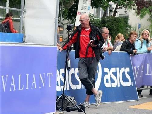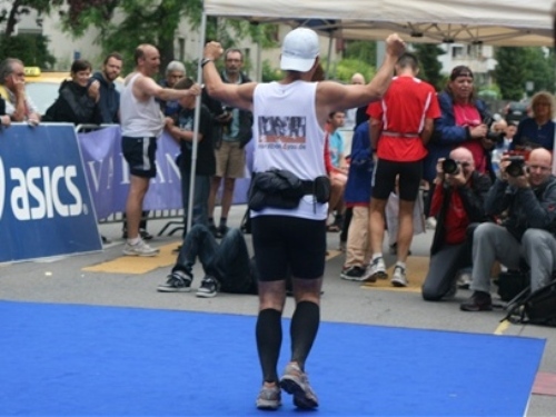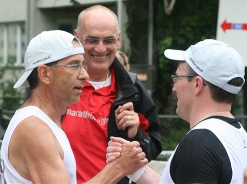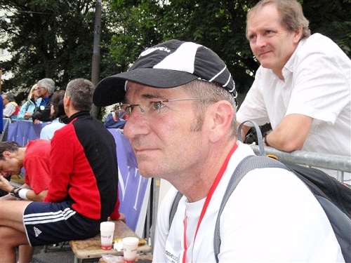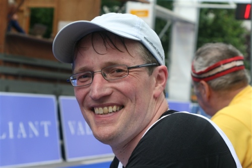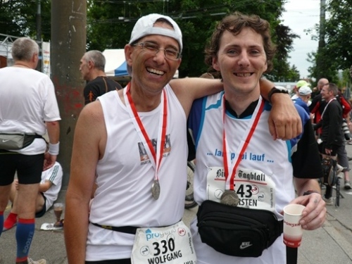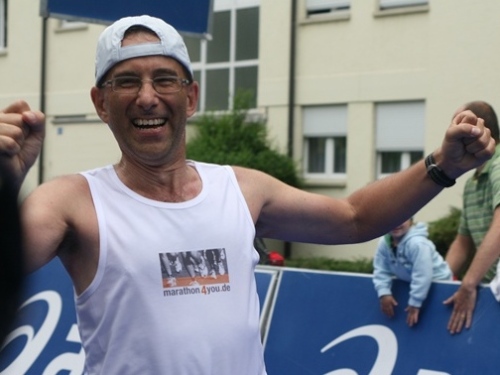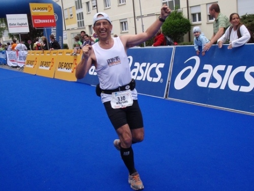 Erst auf den letzten paar hundert Metern laufe ich wieder ins Stadtgebiet und höre schon den Moderator. Staune, daß unmittelbar vor mir mein Lauffreund Thorsten Hintsch ins Ziel kommt, den ich noch gestern beim Start vergeblich gesucht hatte (und er mich). Dann sehe ich es: Das Ziel! Auch für mich finden sich ein paar Klatscher – danke! – und dann entdecke ich Silke und Elke 50 m vor dem Bogen am rechten Rand stehen. Das muß belohnt werden und Elke bekommt einen dicken Kuß. Vielleicht hat mich jetzt noch jemand überholt. Interessiert mich das? In keiner Weise. Sehe Klaus, der mich fotografiert, freue mich darüber und mache auf Papst Johannes Paul II.: Ich knie mich hin, küsse den Zielboden und komme doch tatsächlich ohne fremde Hilfe wieder auf die Beine. Wow. Der Rest ist nur noch Freude.