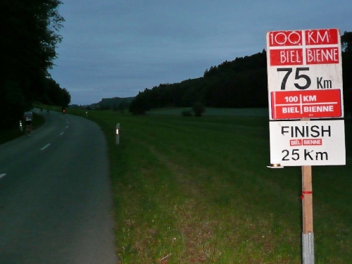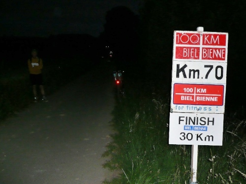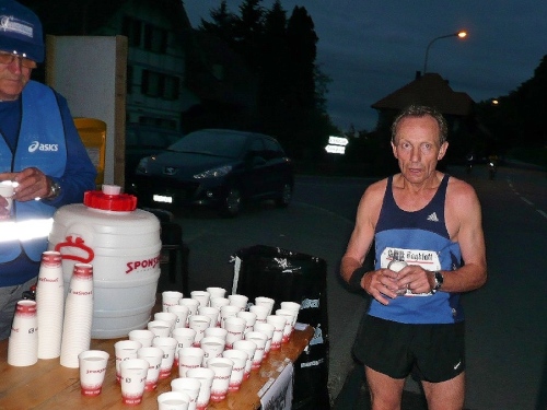 Kilometer 70, es ist jetzt zehn nach Fünf. Von der Dämmerung ist fast noch nichts zu sehen. Die Bewölkung schirmt ab. Einzelne Vögel singen schon. Ab Gerlafingen geht es immer leicht bergauf. Wir laufen an einem Gewässer entlang. Die Helfer an den Trinkstellen sind weiter eifrig dabei. Auch wenn man da mir meinen Wunsch nach Bier nicht stillen kann. „Sie sind ein Läufer“, damit versucht man mir das zu erklären.