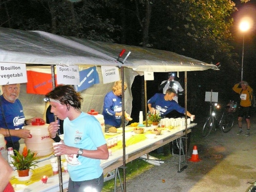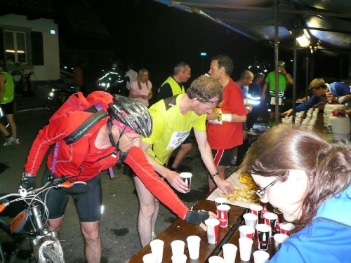 Ravitaillement P3, das ist das französische Wort für Verpflegung. In Buechhof ist wieder Futtern angesagt. Ein paar Meter weiter schläft ein Bub in den Armen seiner Mutter. Müde? Geht nicht bei uns! Augen auf. Und högschte Konzentration!