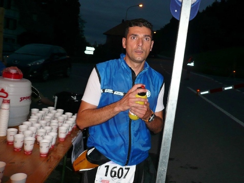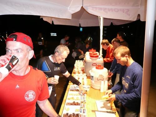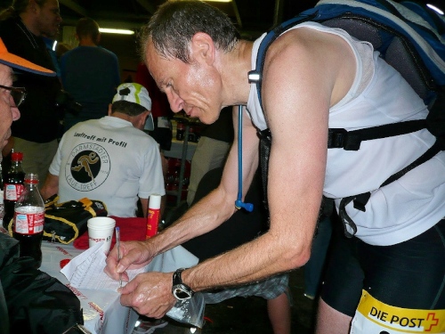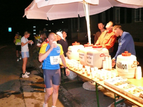 Kilometer 56, Kirchberg, einer der drei Punkte, wo die Ultras mit Wertung ihrer Zeit aussteigen können. An der Tankstelle ein bekanntes Gesicht. Daniel führt Buch über seine Trinkgewohnheiten für die medizinische Studie, an der er teilnimmt. Bei mir müsste da noch eine Zeile für Bier vorgesehen sein! Das erbettele ich mir nebenan in der Festwirtschaft. Wir wechseln ein paar Worte, dann lasse ich ihn hinter mir. Er muss zudem noch seine Stirnlampe auspacken. Ich will nicht zuwarten. Er kommt vielleicht noch von hinten.