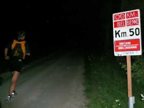 Ein Stück nach dem Ort Jegenstorf überschreiten wir Kilometer 50. Die Hälfte ist geschafft. Ein Pärchen mache ich auf die Halbzeit aufmerksam. Mehr als ein „ja“ kann ich den Schweigsamen nicht entlocken. Es ist zwei Minuten vor drei. 4.58 Stunden Laufzeit. Jetzt passt das Renntempo.