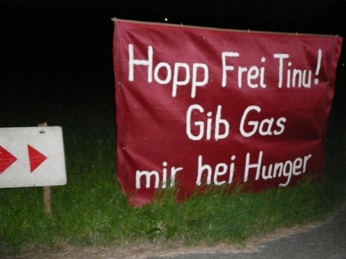 Unterbrochen ist der Pfad durch eine V-Stelle bei Utzenstorf (Kilometer 62,5). Dort erbitte ich mir von übriggebliebenen Zechern einen Schluck Bier, fotografiere diese und stelle als Dank die Möglichkeit der Veröffentlichung ins www in Aussicht. Mal ein anderer Geschmack als immer nur Cola und Iso, auch wenn der Alk sofort in die Birne geht.