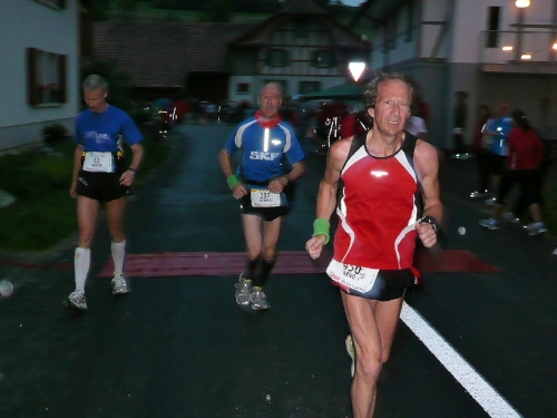 Am Ende des Tales liegt Oberramsern, Ziel der Marathonläufer. Unser Kilometerzähler zeigt jetzt 38,5 Kilometer. Meine Durchgangszeit ist 3.42 Stunden. Es scheint, dass ich jetzt meinen 6er-Schnitt habe. An einem Vorgarten beugt sich ein Läufer über den Zaun. Zuerst höre ich Würgegeräusche, dann kübelt er hinterher. Da wächst nix mehr. Schnell weiter.