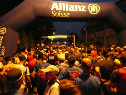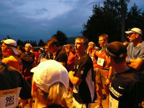 Nach einem guten Fünftel der Strecke sind wir in Lyss. In bescheidener Kenntnis der Verhältnisse in der Schweiz wage ich zu behaupten, dass das Zentrum dieser kleinen Regionalstadt außer an Silvesterabend um Mitternacht sonst nie so belebt ist wie heute. Zu einem kleinen Teil sind dafür auch die Coaches verantwortlich, die hier auf ihre Schützlinge warten und sie bis Kirchberg begleiten und vom Fahrrad aus versorgen dürfen. Kaum sind wir aus dem Siedlungsgebiet heraus, dort wo es keine Straßenlaternen gibt, nervt mich einer dieser Begleiter ungeheuer. Statt mich weiter aufzuregen bitte ich ihn, seinen Scheinwerfer vom Stroboskopmodus auf Dauerlicht zu schalten, was er dann auch tut. Wieso er diesen Lichtzuckungen den Vorrang gegeben hat, bleibt mir ein Rätsel…