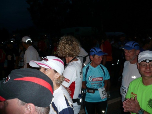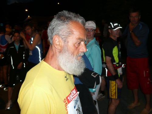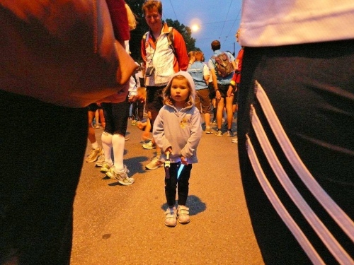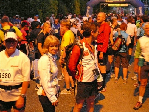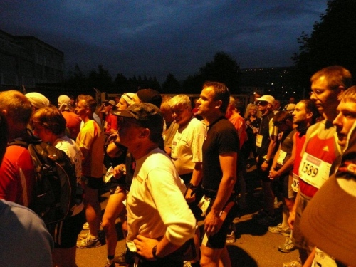Auf den weiteren Kilometern lasse ich das ganze Drumherum des Hunderters auf mich wirken. Die Leute, die überall wieder in der feucht-warmen Sommernacht auf die Athleten warten, die anderen Teilnehmer und das, was ich im Dunkel oder im Schein der Straßen- und Stirnlampen auf und neben der Strecke erkennen kann. Obwohl es eine Nacht vor Leermond ist, könnte ich auf das Licht der verschiedenen Stirnlampen verzichten. Der stete Wechsel von Hell und Dunkel, die unruhig sich hin-und her bewegenden Lichtkegel, die von hinten strahlenden, die Xenonscheinwerfer der Luxusklasse konkurrierende Funzeln, die mich als Schatten im King Kong-Format vor mir auf den Boden werfen, all das stört die Ruhe, in welche ich einzutauchen hoffte.