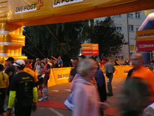 Im Gegensatz dazu stört mich der helle und hörbare Empfang in Aarberg überhaupt nicht. Auf dem ausgelegten blauen Teppich über die alte Holzbrücke, direkt auf den von schönen alten Häusern gesäumten, großzügigen Stadtplatz zu laufen, der zu so später Stunde so lebt, ist ein besonderes Erlebnis. Für die Halbmarathonis, die wie die Marathonis später starten und in Biel noch eine Zusatzschlaufe drehen, ist hier Endstation. Ich bin froh, dass ich weiter darf. Das wäre mir zu wenig.