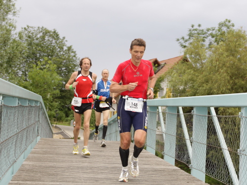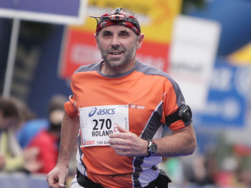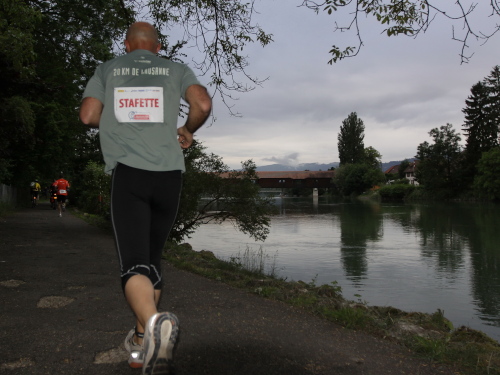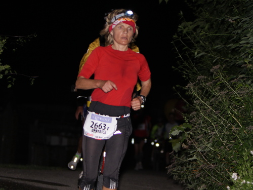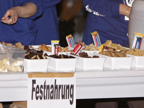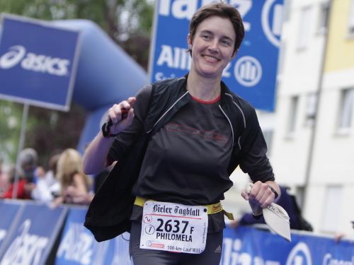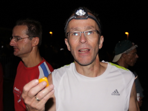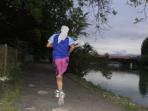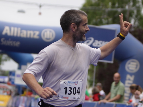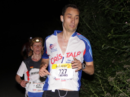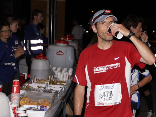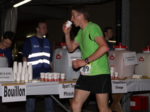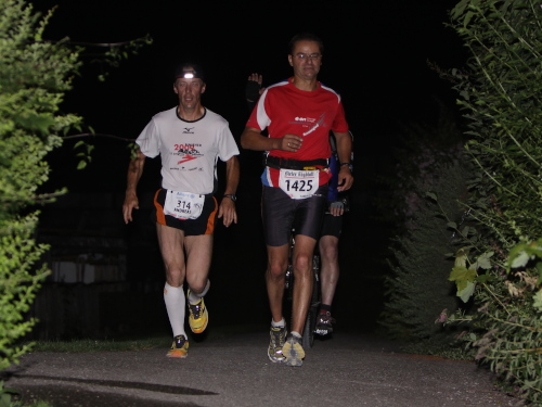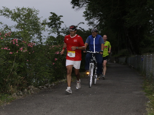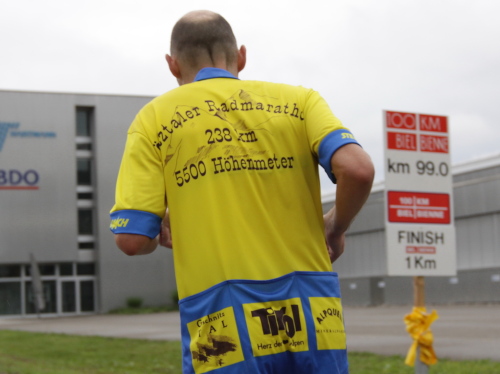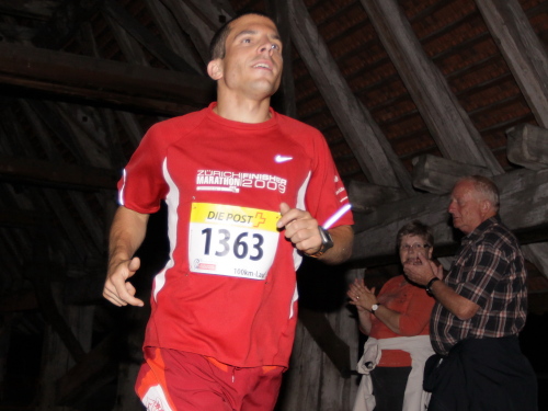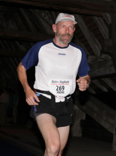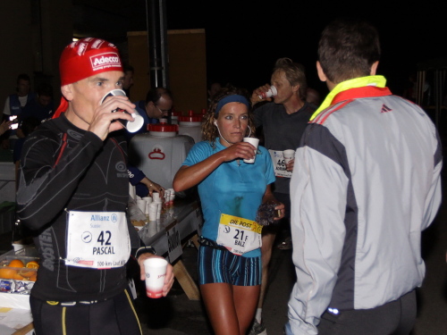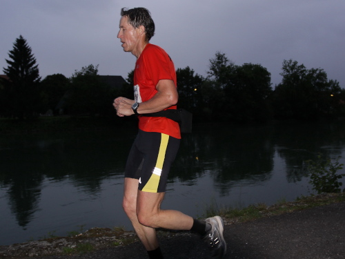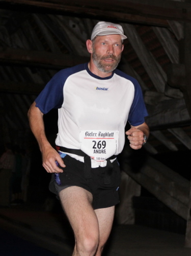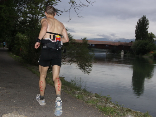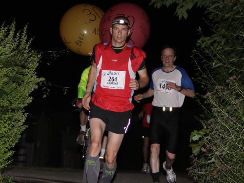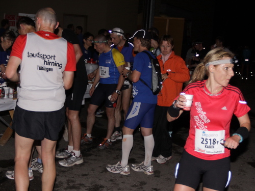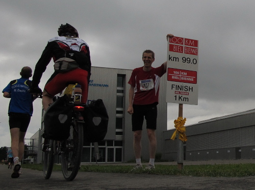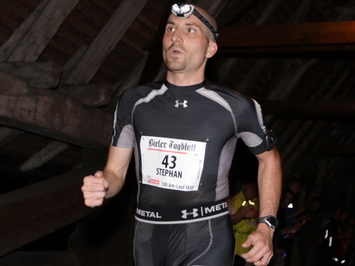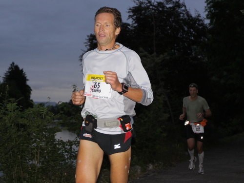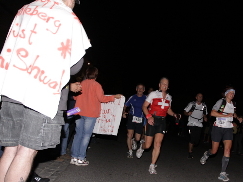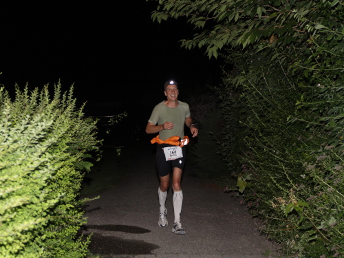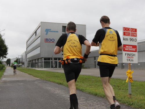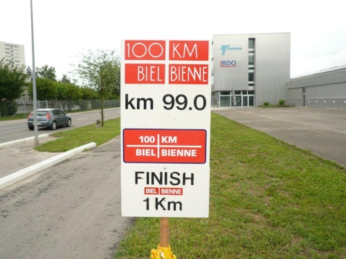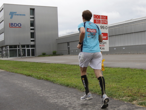 Bei Pieterlen kommt nochmals eine Verpflegungsstelle, an welcher ein Schild mit der Aufschrift 96,6 km hängt. „Schöne Überraschung, jetzt haben wir es bald geschafft“ bemerken wir beide und erleben die Überraschung einen guten halben Kilometer später, wo die offizielle Streckenmarkierung Kilometer 95 anzeigt. Gut, das werden wir jetzt auch noch schaffen, zumal noch eine weitere Verpflegungsstelle zur Rast einlädt. Das Lagerfeuer nebenan macht Lust auf eine Bratwurst, doch es stehen nur drei Stühle ums Feuer, einer zu wenig für uns zwei Läufer und das Helferpaar am Stand. Und bevor ich mir eine Bratwurst schmecken lasse, würde ich gerne eine Dusche nehmen.