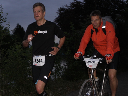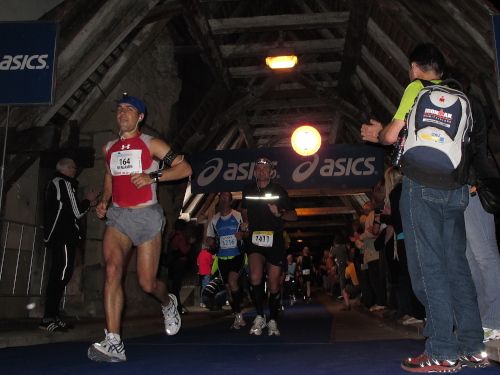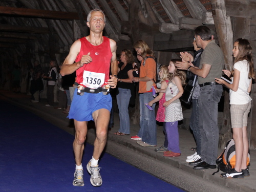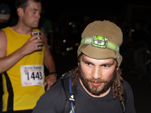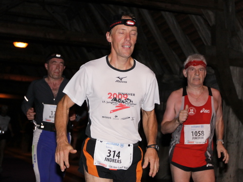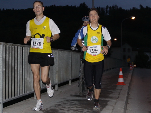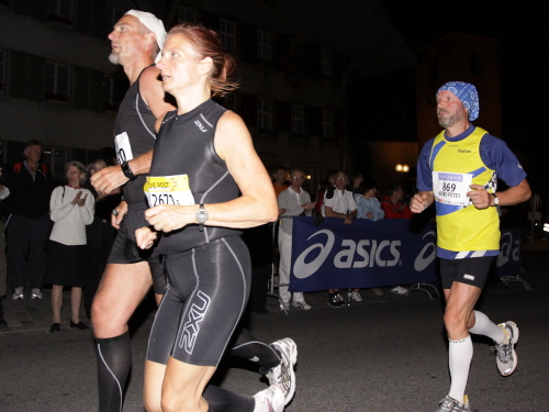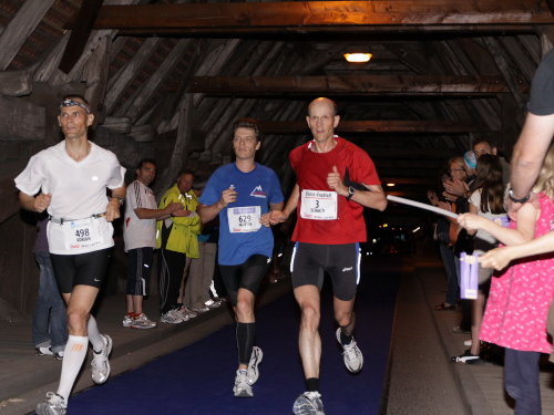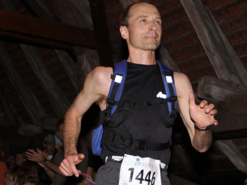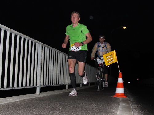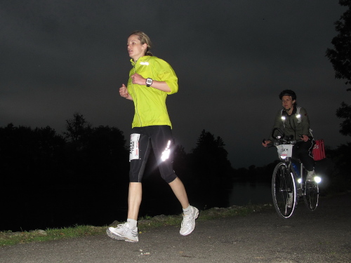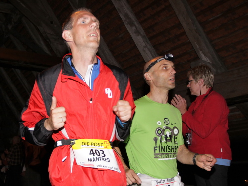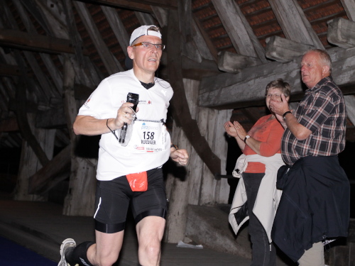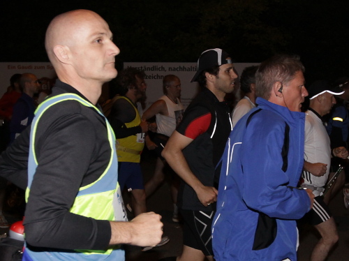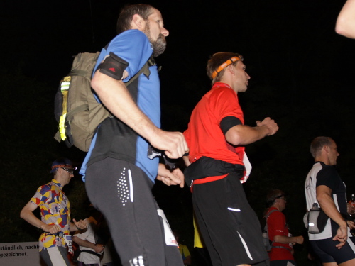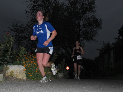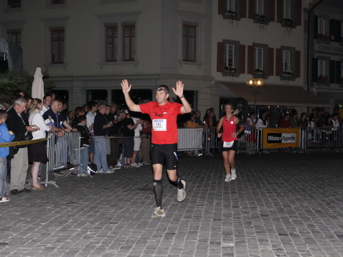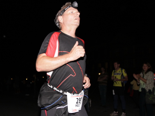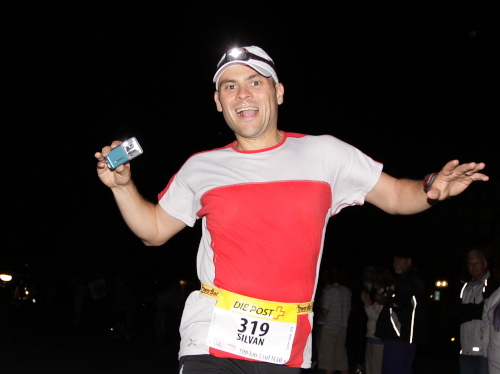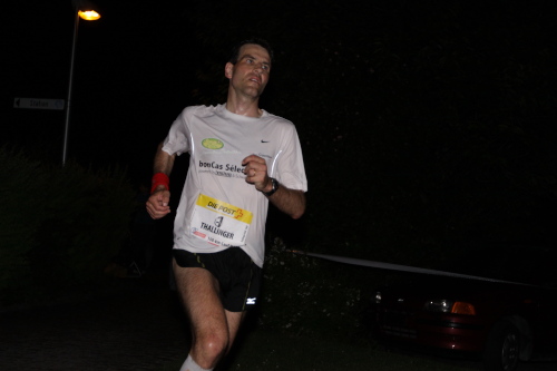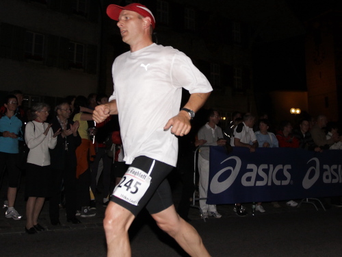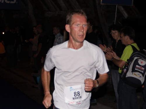 Wir sind nun nur noch eine tiefe dreistellige Meterzahl vom Ziel entfernt, da höre ich, wie Antons Zielankunft verkündet wird. Kurz vor der letzten Kurve vergessen mein Kopf und meine Beine, dass sie sich schon so weit durch die Nacht gekämpft haben. Ich beschleunige, und locker wie ein Knappe die Treppe hoch eilt, um den Ritterschlag zu empfangen, renne ich der Ziellinie entgegen. Anton steht mit der Kamera bereit, um mein Strahlen bildlich zu dokumentieren.