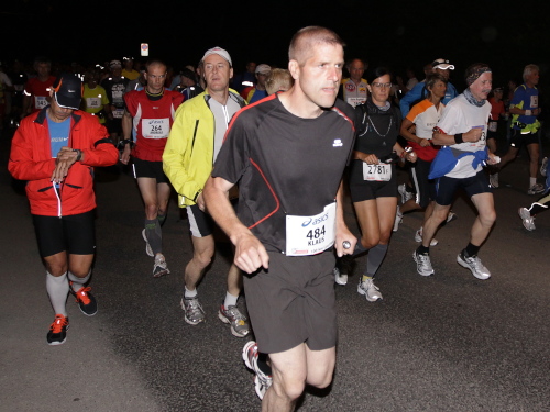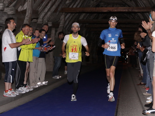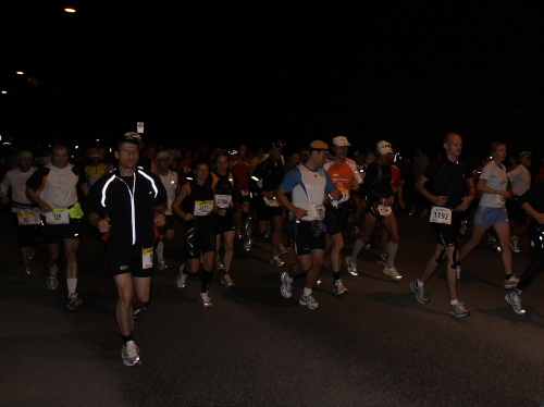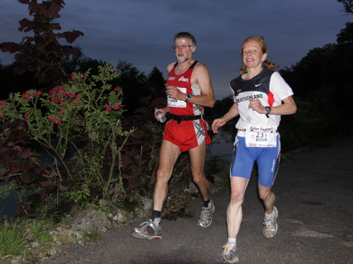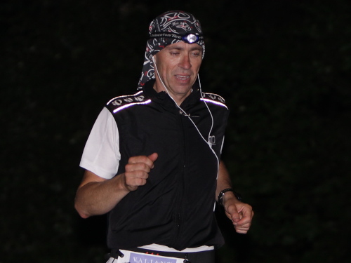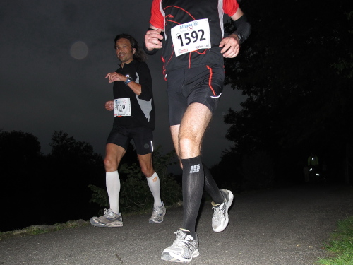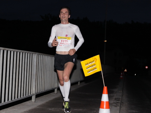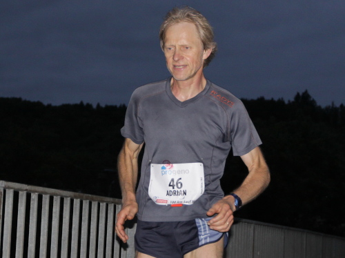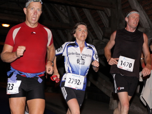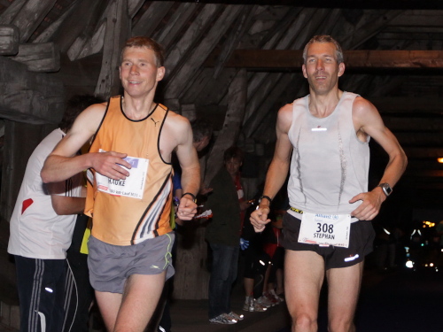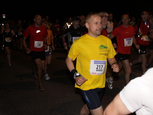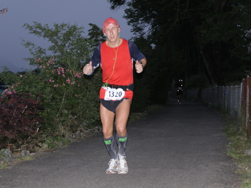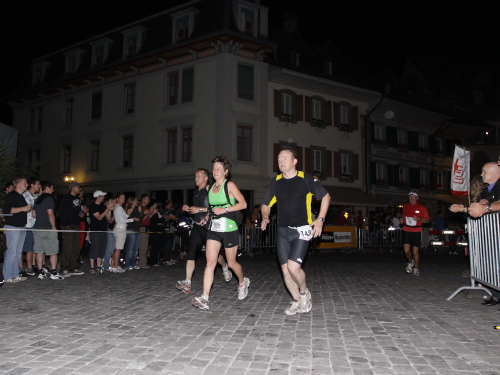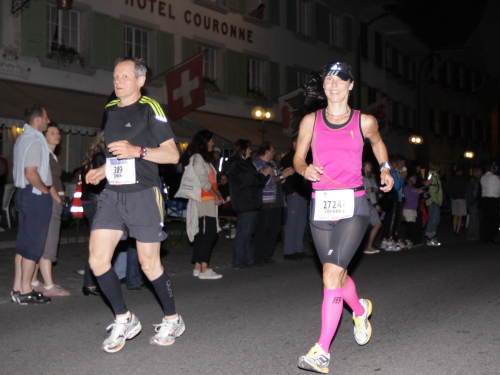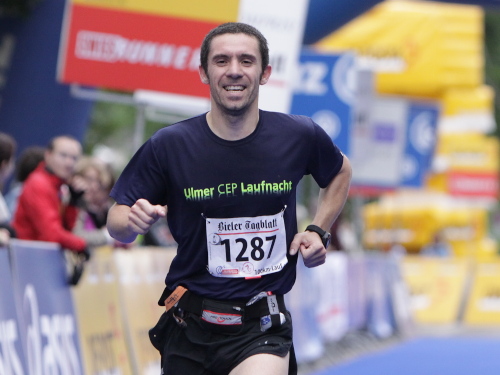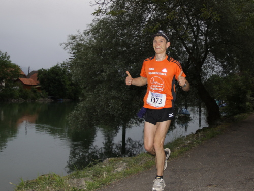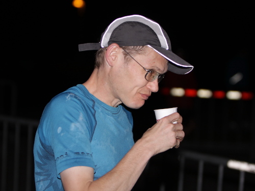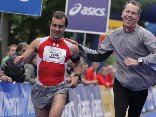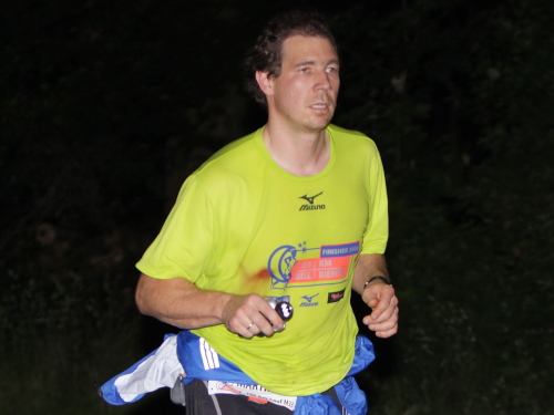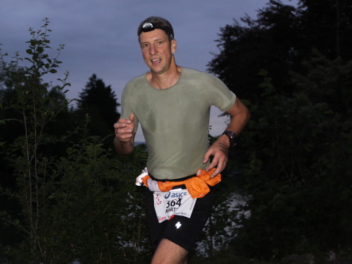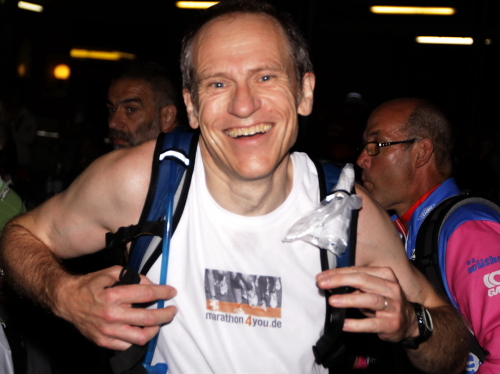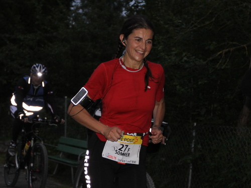 Wir sind nun nur noch eine tiefe dreistellige Meterzahl vom Ziel entfernt, da höre ich, wie Antons Zielankunft verkündet wird. Kurz vor der letzten Kurve vergessen mein Kopf und meine Beine, dass sie sich schon so weit durch die Nacht gekämpft haben. Ich beschleunige, und locker wie ein Knappe die Treppe hoch eilt, um den Ritterschlag zu empfangen, renne ich der Ziellinie entgegen. Anton steht mit der Kamera bereit, um mein Strahlen bildlich zu dokumentieren.