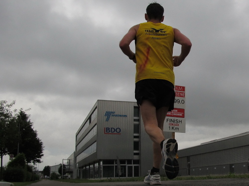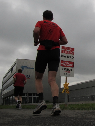 Die letzen zwei Kilometer verfügen nicht über landschaftliche Reize. Der Reiz liegt darin, dass es die beiden letzten von einer ganzen Menge sind, die beiden letzten, die mich vom gemeinen Langstreckenläufer zum Finisher eines 100km-Laufs machen. Kilometerschild 99 muss ich noch auf den Chip bannen, auch wenn ich sonst kaum fotografiert habe.