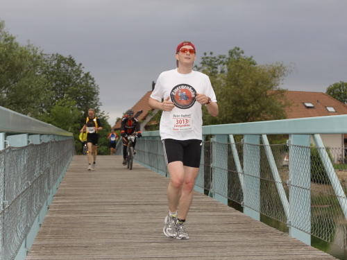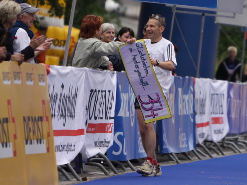 Die Urkunde, die mir beim Abholen des Finisher-Shirts ebenfalls überreicht wird, dokumentiert, dass mein Geschwindigkeitsabfall in Bezug auf meine Rangierung keine Auswirkung hatte. Von der Durchgangszeit nach dem ersten Teilstück bis ins Ziel habe ich 35 Plätze in meiner Alterskategorie gutgemacht. Da haben andere offenbar noch gröbere Anfängerfehler gemacht als ich.