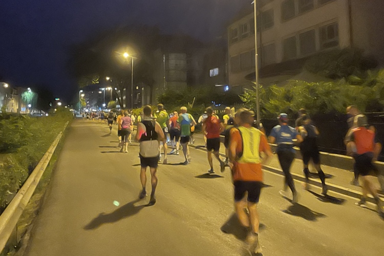 Vom Licht ins Dunkle: Kurz nach Kappelen folgt eine Streckenänderung. Statt durch Aarberg über die schöne alte Holzbrücke und über den Marktplatz zu laufen, weichen wir aufgrund von Bauarbeiten nach links aus und laufen bis Lyss durch einen ziemlich dunklen Wald. Wenige Läufer nutzen hier ihre Stirnlampe, auch ich habe meine noch nicht aufgesetzt, so ist die Passage in der Finsternis besonders eindrucksvoll. Von den Bäumen sind nur Schatten zu sehen, der Weg ist aber im fahlen Restlicht noch erkennbar, da mit hellem Schotter belegt.