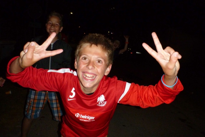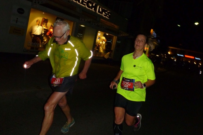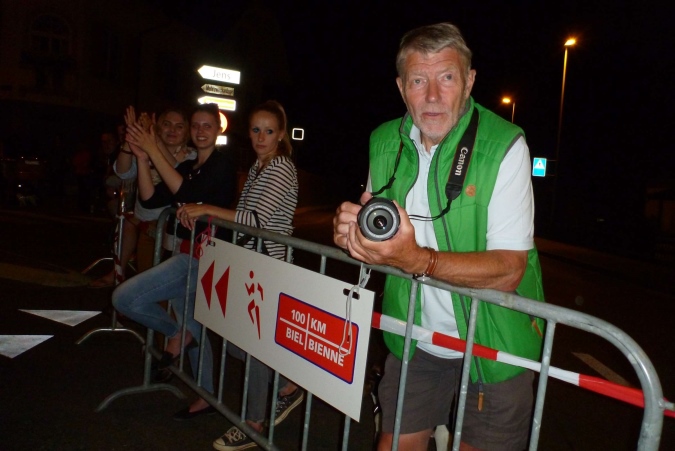 Genau zum Startschuss reißt vor mir jemand seine Hände hoch. Los geht’s zum 57. Bieler Hunderter. In wenigen Sekunden überschreite ich die Startlinie. Als Fotograf mit einer einfachen Kamera in der Nacht brauchbare Bilder zu schießen, ist nicht einfach. Ich nutze dafür die Startrunde, da es nicht ganz finster ist und die Straßenbeleuchtung noch ein wenig helfen kann. Landschaftsaufnahmen sind während der Dunkelheit unsinnig, so muss ich mich halt auf Zuschauer, Mitläufer und das Personal bei den V-Stellen beschränken. Viele Neugierige stehen am Rand der Strecke und geizen nicht mit Applaus.