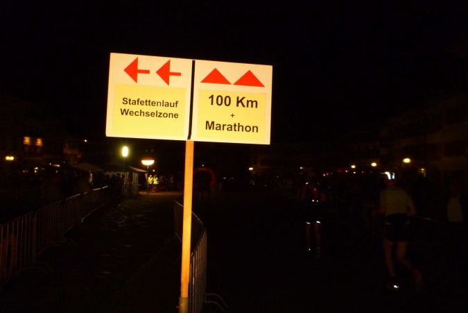 Der Kanonenschlag um 21.30 Uhr für den Start der Begleitradler reißt mich aus der Ruhe. Sie dürfen nicht mit den Läufern in Biel starten, sondern müssen nach Lyss fahren, wo sie sich dann unter die Läufer mischen. Für 25 EUR erhalten sie eine spezielle Startnummer, mit der sie auch die offiziellen Verpflegungsstellen nutzen können. Es gilt der Grundsatz, dass die Radfahrer Rücksicht auf die Läufer nehmen müssen. Etwa 20 Minuten vor dem Start um 22.00 Uhr gehe ich in die Startaufstellung. Blöcke mit jeweiligen Laufzeiten gibt es hier nicht. Jeder weiß, wo es sich hinzustellen hat. Und ein Hunderter wird nicht im Startsprint entschieden.