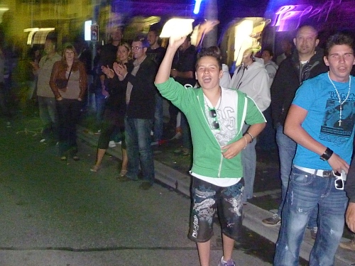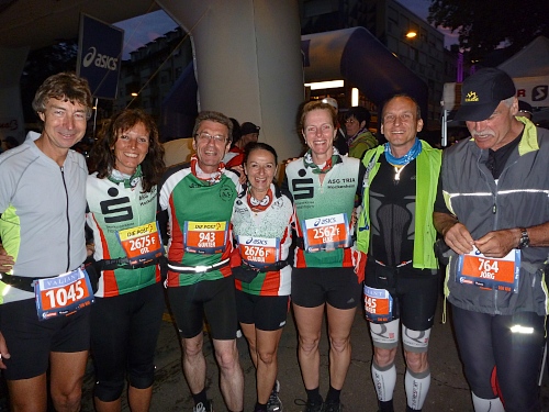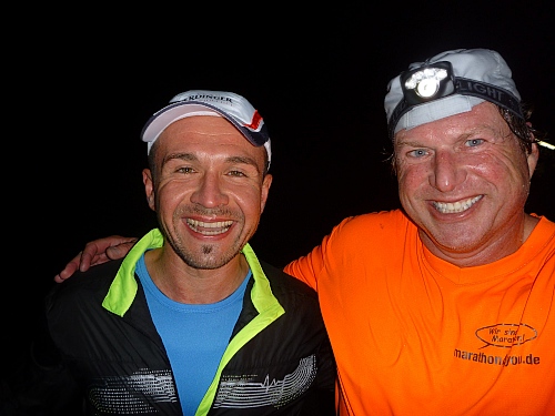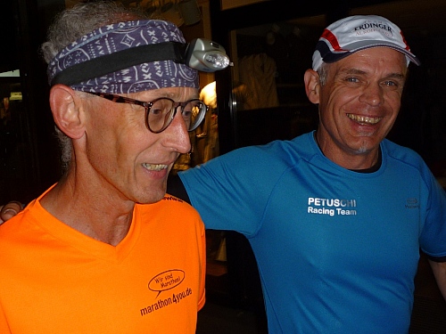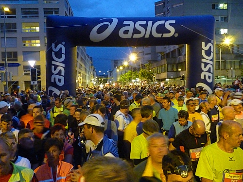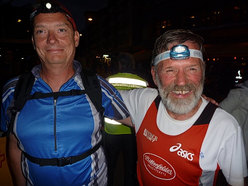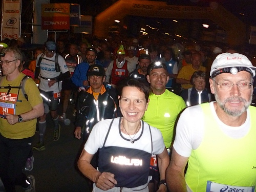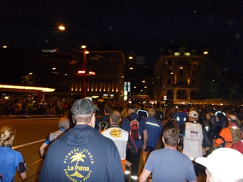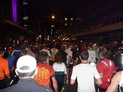 Schnell ist es 22 Uhr. Wie letztes Jahr laufen wir  zwischen den abgesperrten Zuschauern der Innenstadt, dennoch eine eigenartige Ruhe zwischen all den vielen Menschen. Zu schnell wie immer, man lässt sich mitreißen. Nach einer ruhigeren Schleife geht´s nochmal durch die Innenstadt. Ralf, der Rückwärtsläufer ist fünf Minuten vor uns gestartet. Ich entdecke Anton, rufe ihm zu, dass ich jetzt mit Ralf zusammen  laufe, weil Bekloppte in der Nacht der Nächte meine Begeisterung wecken.