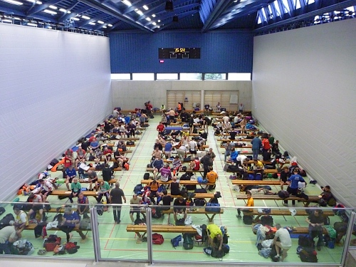 Das regensichere Festzelt ist direkt an der Kongresshalle, der Chinese gegenüber recht teuer. In der  Esplanade-Halle befinden sich drei Sporthallen für Umkleide- und Wartezeit. Ich fotografiere nur die Herrenhalle von der Tribüne aus, in der Damenhalle ist einfach nix los, stehen alle vor dem Klo. Scheint ein läuferinnenspezifisches Ritual zu sein.