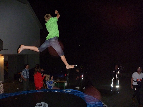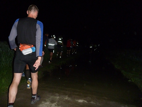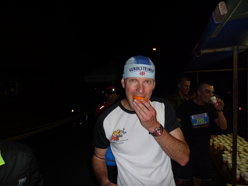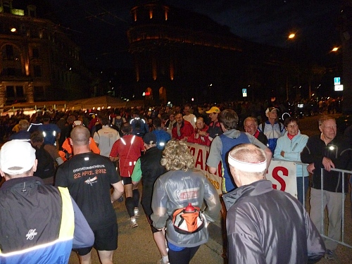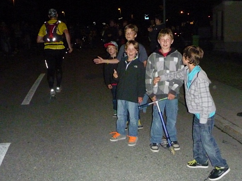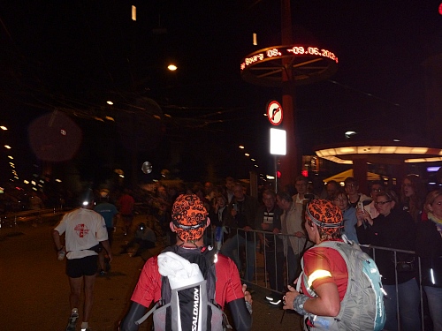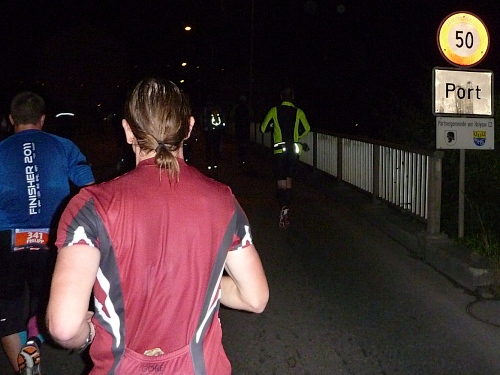 Ich sehne mich nach Jens. Kein Typ, ein Ort mit Steigung. Doch ehe es keine Zuschauer mehr gibt, muss ich noch ein Stück bergauf laufen, erst hier ab km 10  bin ich Ultraläufer, kann mich beim Gehen erholen. Zuschauer, Häuser und Strassenlaternen verschwinden in der Ferne, zum Glück hinter mir. Stirnlampen werden sprachlos eingeschaltet, produzieren wippende Monster auf dem Asphalt.