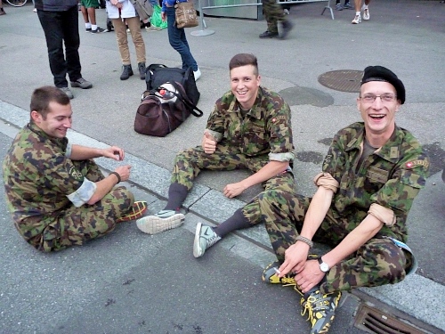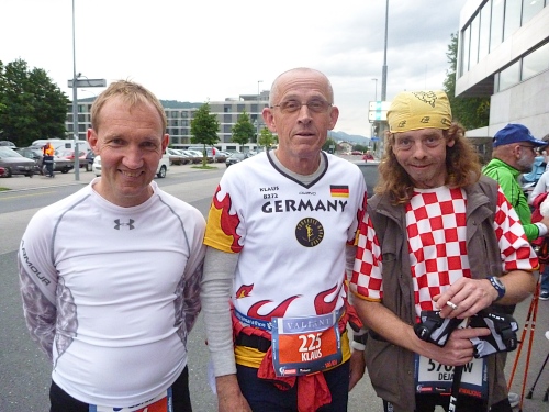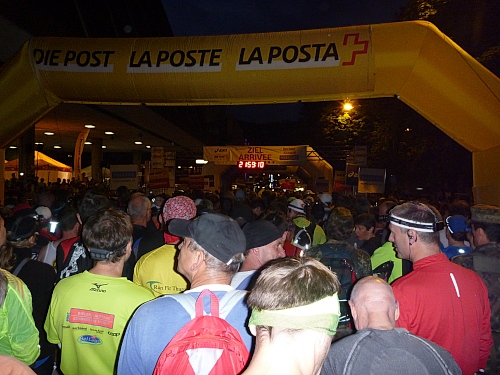 Eigenartige Stimmung, Fotos täuschen Kampfgeist vor. Niemand käme hier auf die Idee, sich  klatschend und hüpfend aufzugeilen. Nur wenige heben die Hände. Aber der Sprecher hat es auch  kaum erwartet, bei Läufern die mit jeder Kalorie rechnen müssen und sich nur dehnen, wenn der Schuh gebunden werden muss. Oder wie ich, der noch einen Rest Liechtenstein aus der  Socke  schütteln muss.