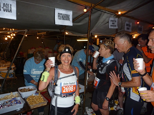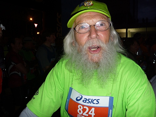 Der grüngepuschelte Cabanaut macht vor, was sich das OK für die nächsten Jahre wünscht: Run and Fun. 13 Stunden später sehe ich, wie sich ein Offizieller bei ihm bedankt, denn 100 km in Grünpuschel sind nicht vergleichbar mit 42 km in Ketten. Run and Fun, mein ureigenes Motto.