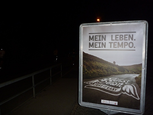 Das km 1-Schild wollte ich nicht fotografieren, das km 3-Schild ist schon Hohn genug. Es ist schwierig in der Dunkelheit vernünftige Fotos zu schiessen. Die Kamera braucht Ewigkeiten zum Fokussieren, erwischt bewegte Objekte kaum, frisst den Akku. Ein Akkuwechsel auf 100 km entscheidet nun auch nicht gerade die Platzierung, doch ich werde heute von vielen Wechseln berichten müssen. Wie gesagt, keine Nacht in Biel ist gleich. Und diesmal geht mir die Nacht der Nächte ziemlich auf den Magen. Magen-Woodstock,  das ist der Name der Königin der Läufe.
