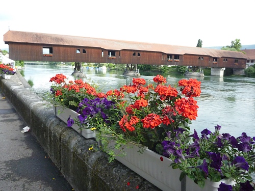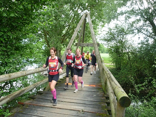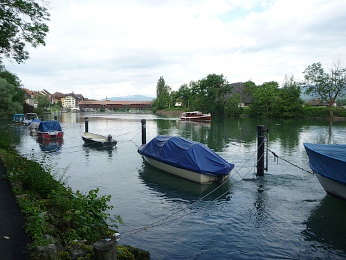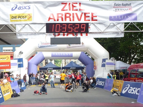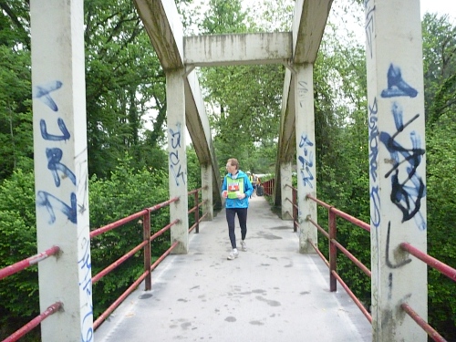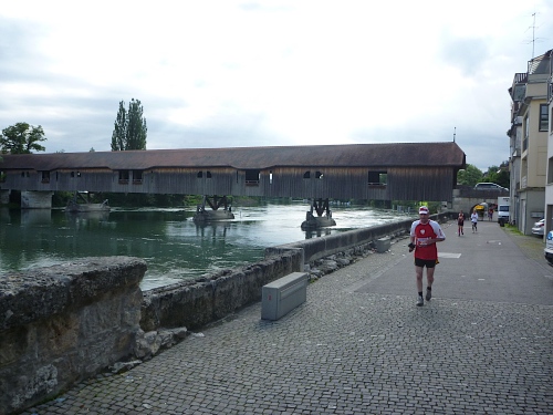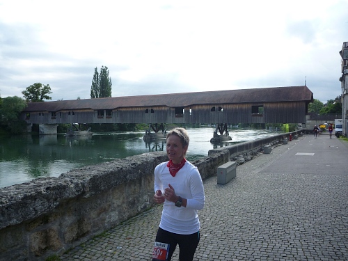 In Aarberg dann diese Holzbrücke. Der Chef sagte noch: „Joe, mach anständige Fotos!“ Aber die Kamera ist durcheinander und Kontaktlinsen ermöglichen keine Moduseinstellung. Wenn jetzt Atomkrieg wäre, wäre es mir auch egal. Flattermänner, die ich mit den Zähnen abfangen muss, sind zahlreicher als Zuschauer, das war auch mal anders hier beim Ziel des Halbmarathons.