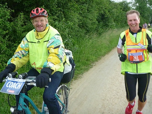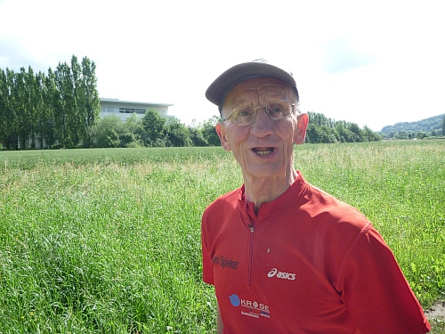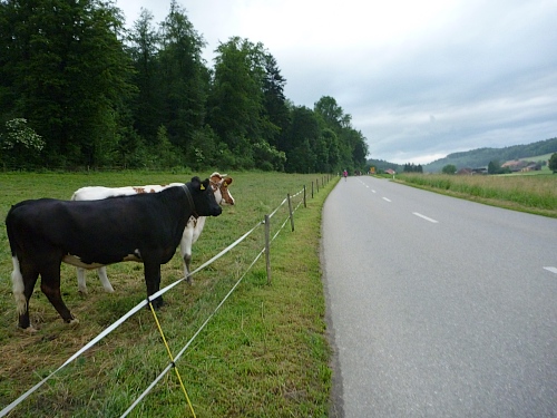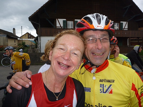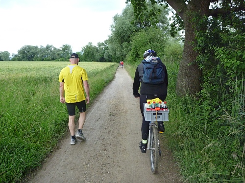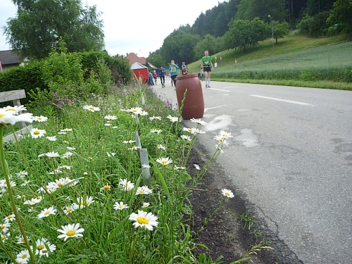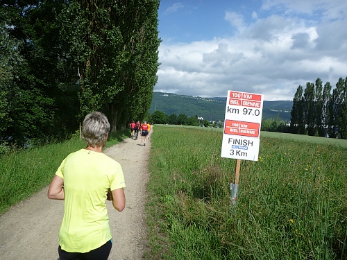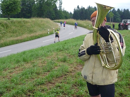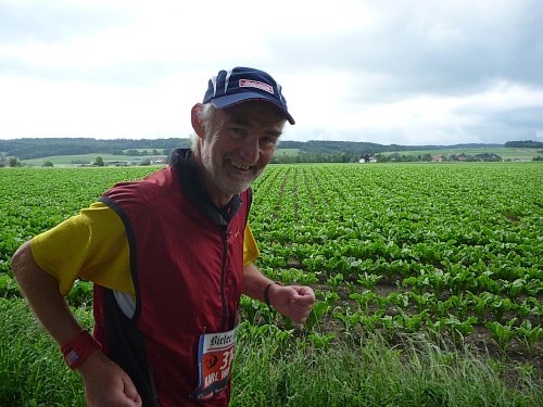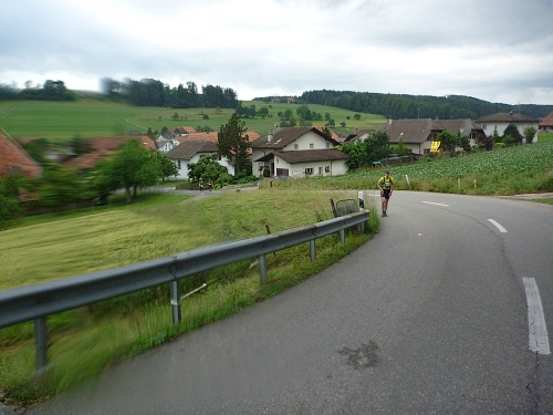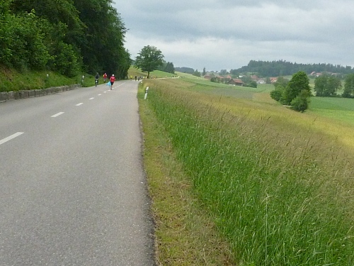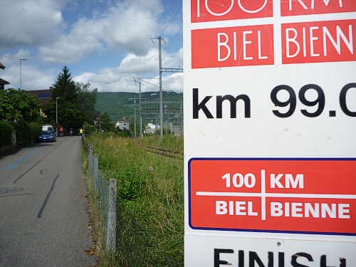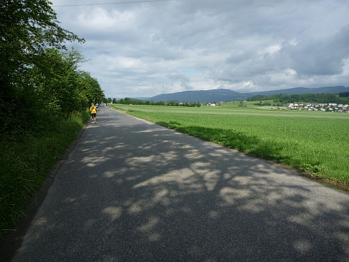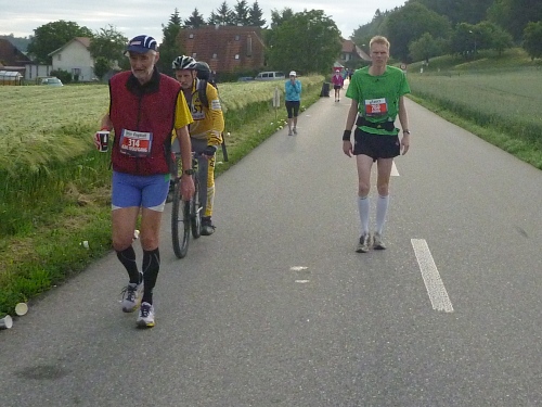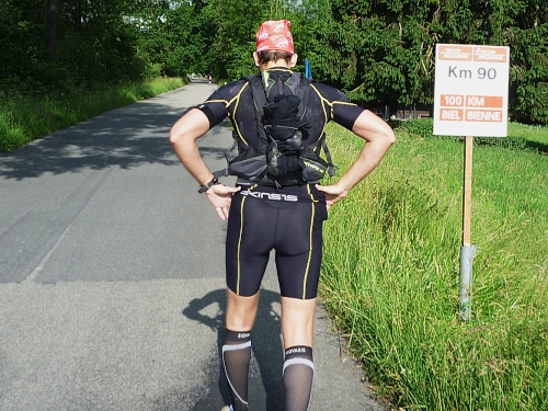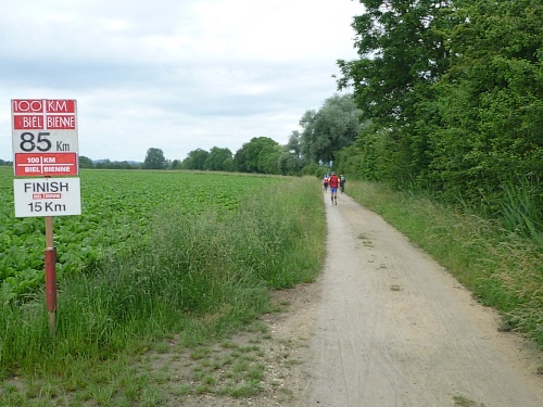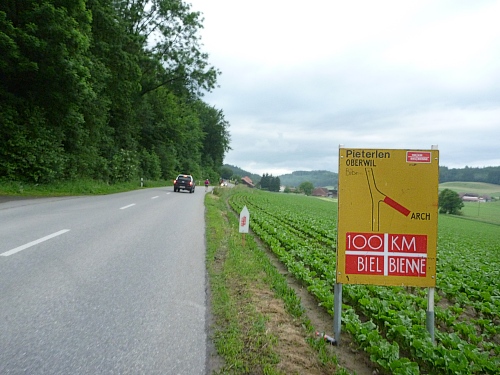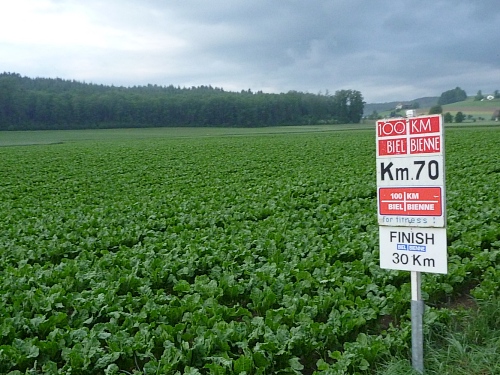 Km 26 - die Kurve von Grossfoltern, dann endlich kommt meine Traumstrecke. 7 Km geradeaus auf ebener Strecke. Nur Wendy erwischt mich bei meinem traditionellen Boxenstopp bei km 35 (Balm). Längst bin ich hier bekannt und mit lautem Hallo bekomme ich mein Gratis-Iso-Getränk. Tatsächlich ist es so, dass die Wirtshäuser und Bierschänken nur wegen unserer 100 km langen Peepshow geöffnet haben.